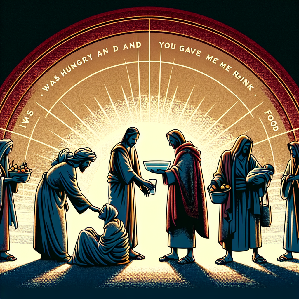 In this passage, Jesus is speaking about the final judgment and explaining how acts of kindness and compassion are valued in the Kingdom of God. Each of the actions mentioned – feeding the hungry, giving drink to the thirsty, welcoming strangers, clothing the needy, caring for the sick, and visiting prisoners – are not just good deeds. They are expressions of divine love and service to Jesus Himself.